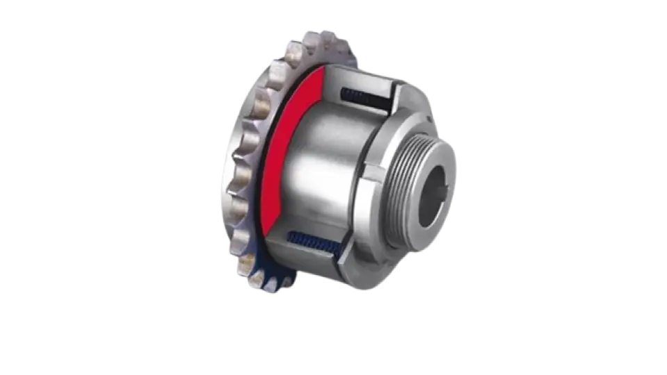 Po osiągnięciu zadanego momentu poślizgowego, wbudowany element (np. koło łańcuchowe) zaczyna się ślizgać.